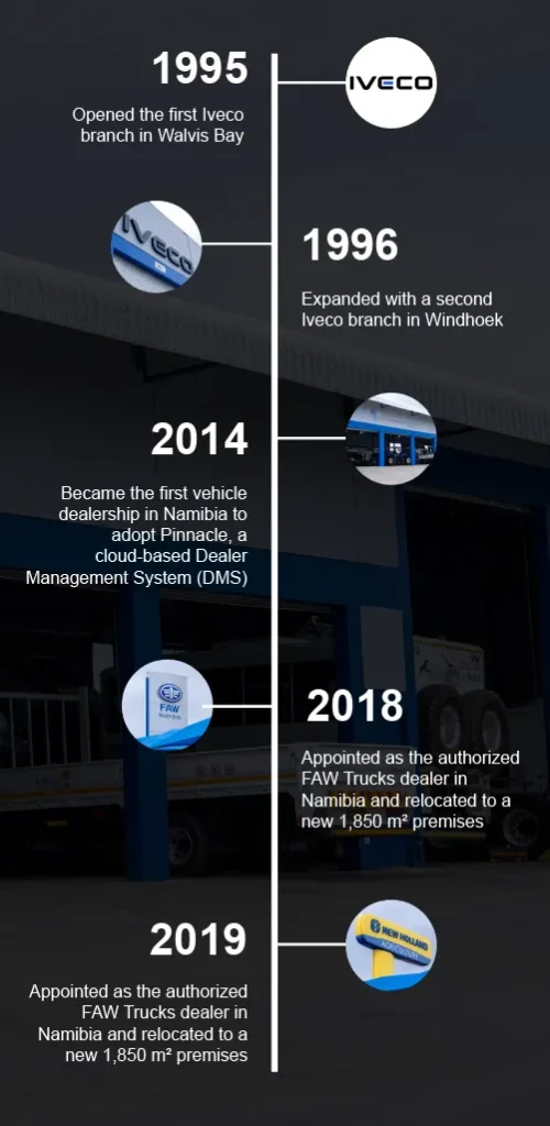 From its beginnings as Namibia’s first authorized Iveco dealer, ACV has grown into a cornerstone of reliability and excellence with branches in Windhoek and Walvis Bay. Our commitment to quality service, customer support, and sustainable growth ensures that businesses across Namibia keep moving forward.